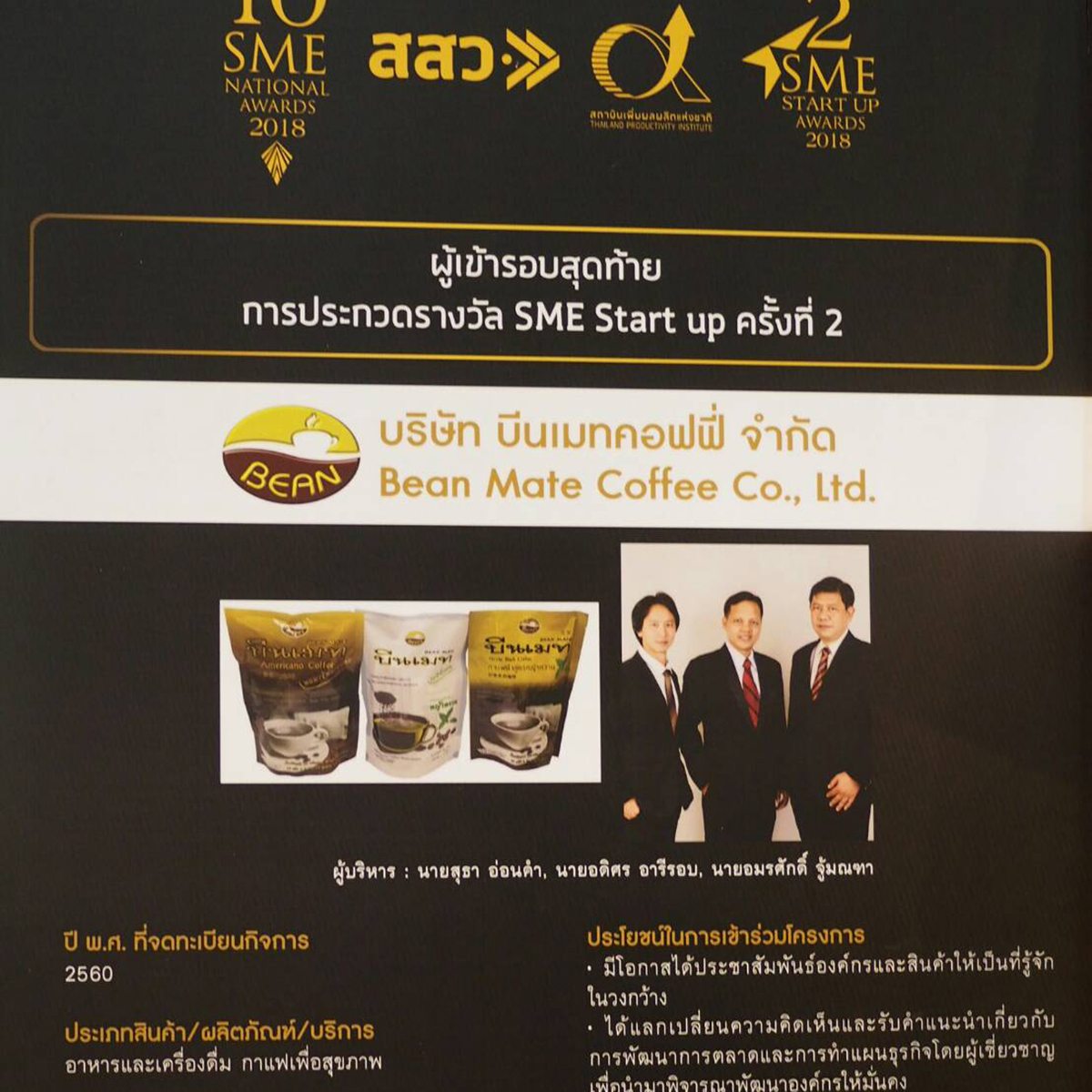 - สิงหาคม 2561 บีนเมทคอฟฟี่ผ่านการคัดเลือกเข้าร่วมโครงการพัฒนาสู่สุดยอดเอสเอ็มอีจังหวัด (SME Provincial Champions) ในการก้าวสู่ Thailand 4.0
